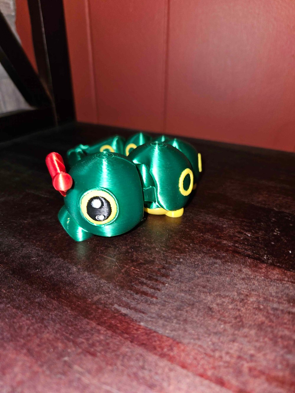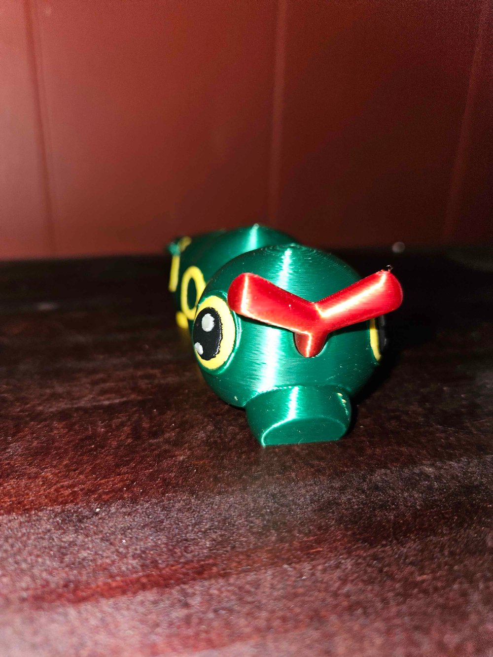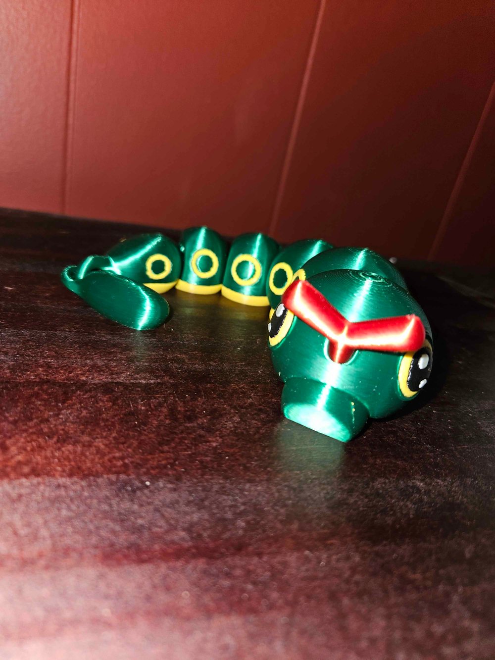 A 3D Printed Caterpie fidget toy. This handheld fidget toy is a great gift for any Pokemon fan. It is printed with Green Ice Jessie filament from Printed Solid.
